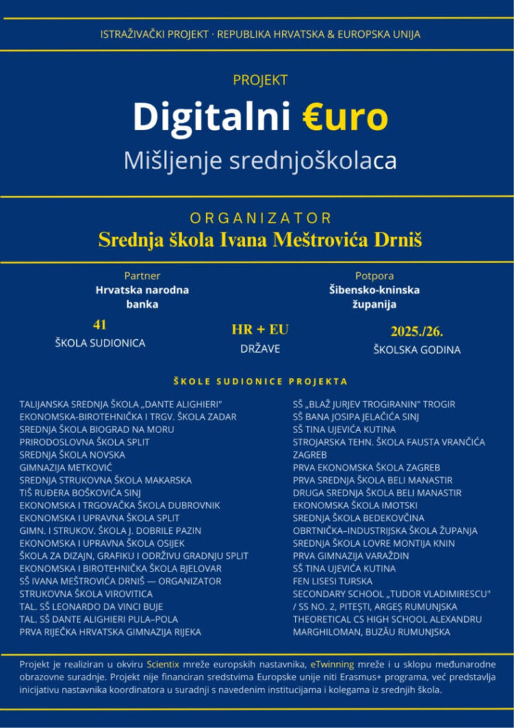 U svijetu koji se ubrzano digitalizira, pitanje financijske pismenosti i razumijevanja novih tehnologija postaje ključno za mlade generacije. Upravo zato se Ekonomska škola Imotski s ponosom uključila u hvalevrijedan istraživački i obrazovni projekt „Digitalni euro – mišljenje srednjoškolaca“.